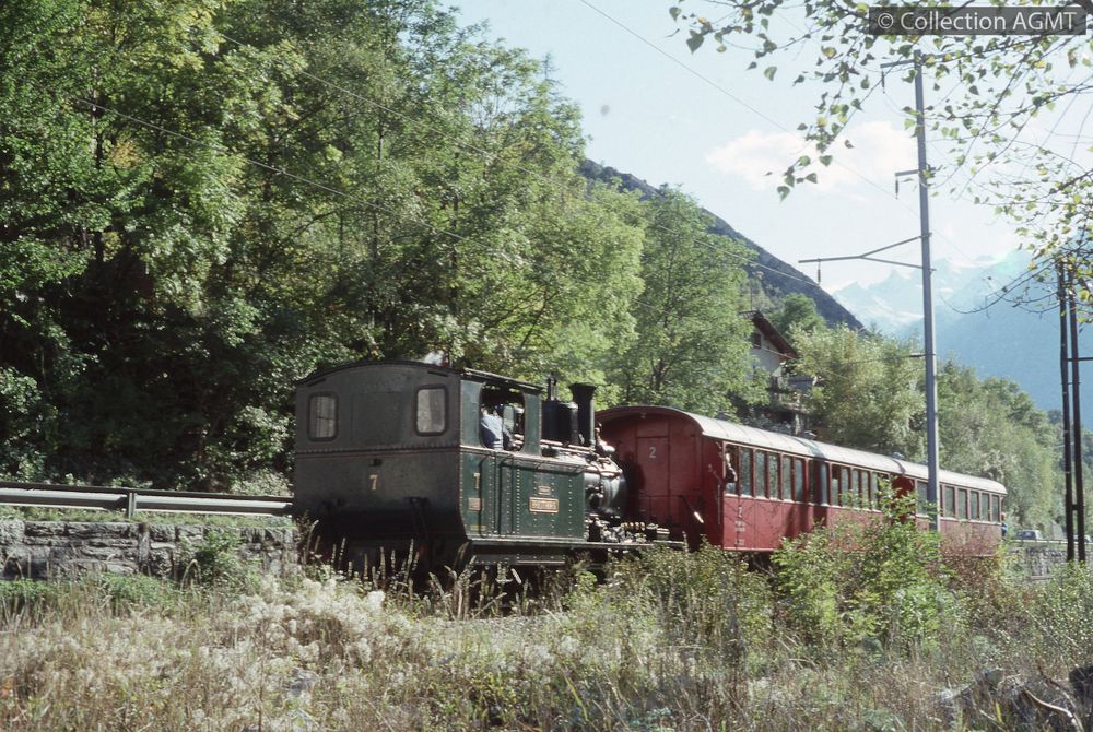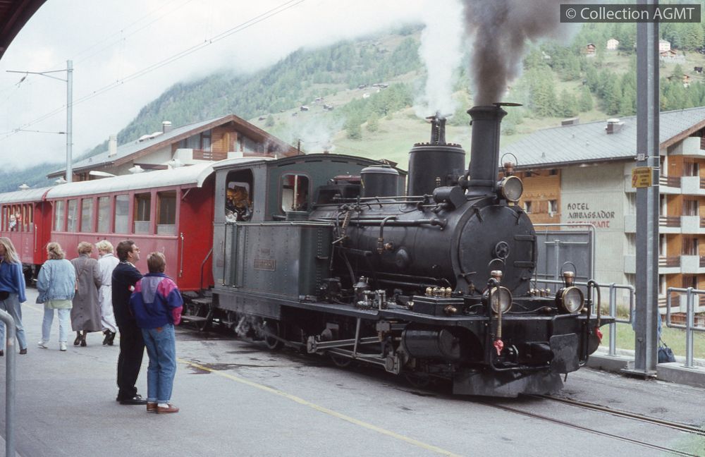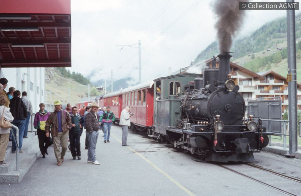 4348(494.44)_BVZ_1991-09_d.jpgImage JpegUn train à vapeur du BVZ, mené par la locomotive HG 2/3 7, stationne à Zermatt sur la voie de raccordement avec le GGB / Jeremy Wiseman
