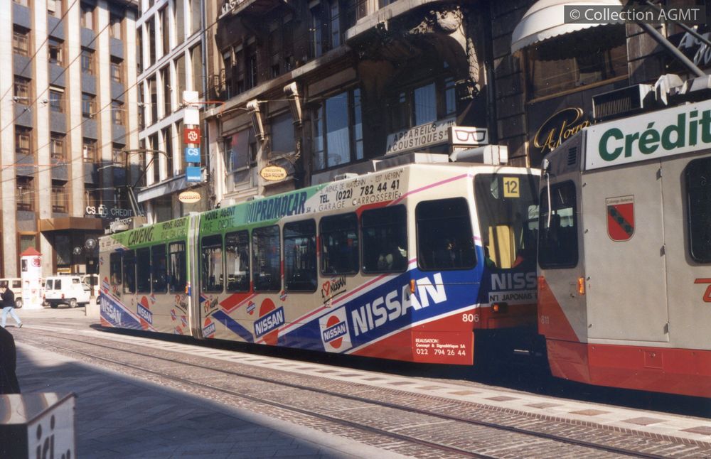 Mené par l'automotrice Be 4/6 806 des TPG en livrée publicitaire "Nissan", un convoi de la ligne 12 à destination du Bachet marque l'arrêt "Bel-Air" [document graphique à deux dimensions] / Gaston Guignard, Photographe . - [S.l.] : Kodalux, 1991 . - 1 photo : couleur ; 10 x 15 cm. Langues : Français ( fre) |  |