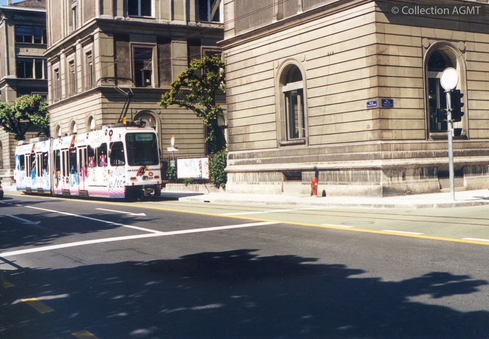 En service sur la ligne 13 à destination de Cornavin, l'automotrice Be 4/6 810 des TPG, en livrée publicitaire "RSR" circule à la rue des Terreaux-du-Temple [document graphique à deux dimensions] / Gaston Guignard, Photographe . - [S.l.] : Kodak royal, 1995 . - 1 photo : couleur ; 10 x 14 cm. Langues : Français ( fre) |  |