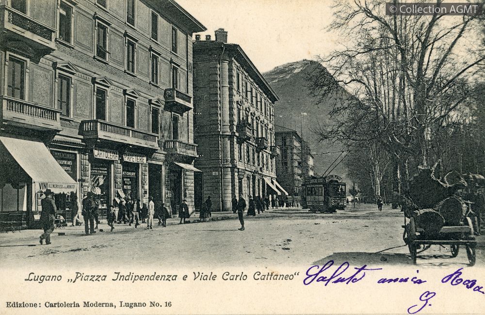 [Compagnie] TEL (Lugano)Index. décimale : 3141 Tramway et métro léger urbain - véhicule - service régulier, transport de voyageur Lugano : piazza Indipendenza e viale Carlo Cattaneo [document graphique à deux dimensions] . - Lugano : Cartoleria moderna, [ca 1905] . - 1 carte postale : noir et blanc ; 9 x 14 cm. - (Cartoleria moderna; 16) .