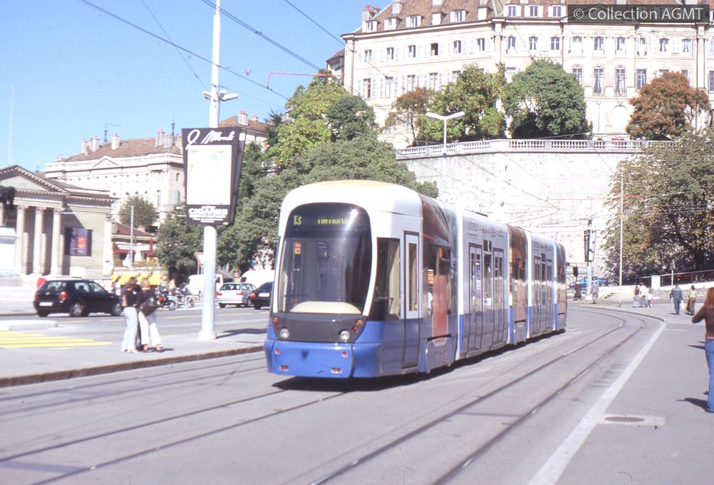 3148(494.42)_AGMT_2004-05_d.jpgImage JpegUne automotrice "Cityrunner" louée à Lodz en attendant la livraison du matériel genevois stationne sur la voie centrale de la place de Neuve / Jeremy Wiseman