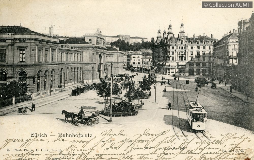 [Année] 1900Index. décimale : 3141 Tramway et métro léger urbain - véhicule - service régulier, transport de voyageur Zuerich : Bahnhofplatz [document graphique à deux dimensions] . - Zuerich : Phot. Ph. u. E. Link : Zuerich : Br. & Co., [ca 1900] . - 1 carte postale : noir et blanc ; 9 x 14 cm. - (Ph. u. E. Link; 6) .