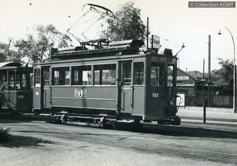 Code-barres Cote Support Localisation Section Disponibilité 6700037102 3141(494.231) BVB 1968/09 Photographie Bachet Photographies Disponible Un convoi BVB formé de l'automotrice 103 et de la remorque 1123 stationne au dépôt Dreispitz / Jeremy Wiseman