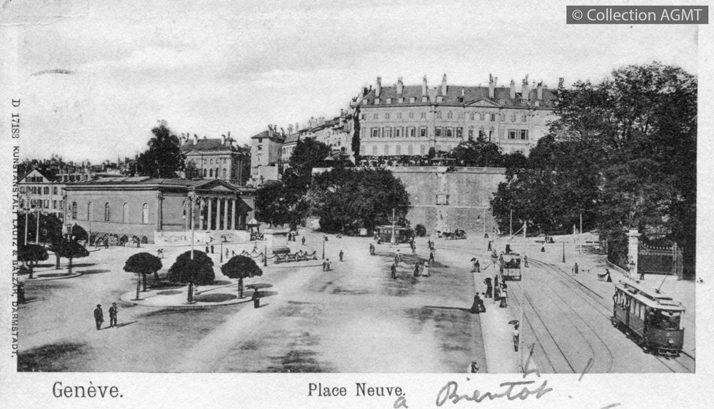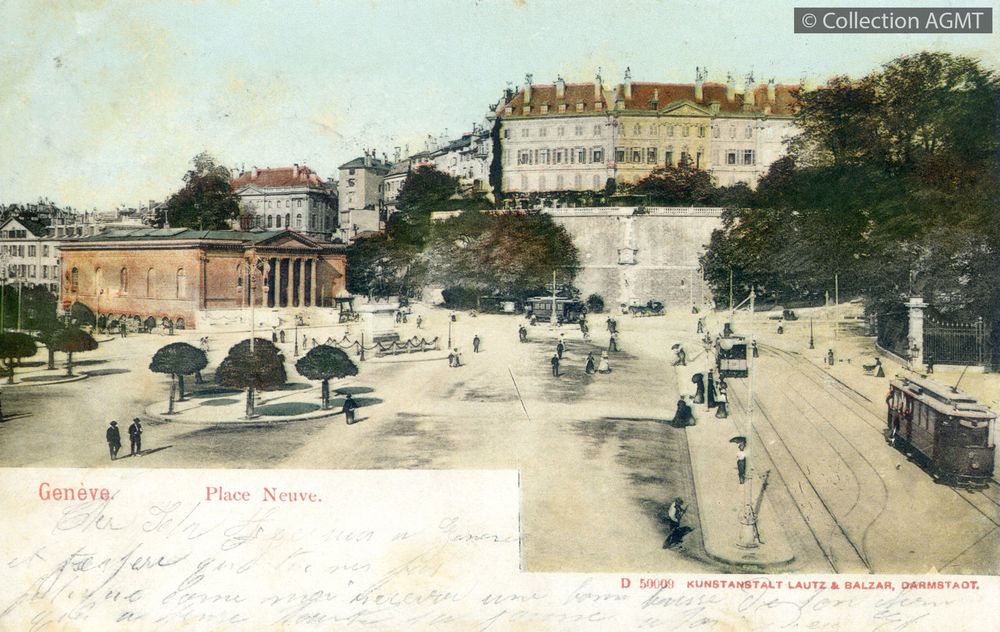 [Année] 1904Index. décimale : 3141 Tramway et métro léger urbain - véhicule - service régulier, transport de voyageur Genève : place Neuve [document graphique à deux dimensions] . - Darmstadt : Kunstanstalt Lautz & Balzar, [ca 1904] . - 1 carte postale : colorisée ; 9 x 14 cm. - (Lautz & Balzar; D 50009) .