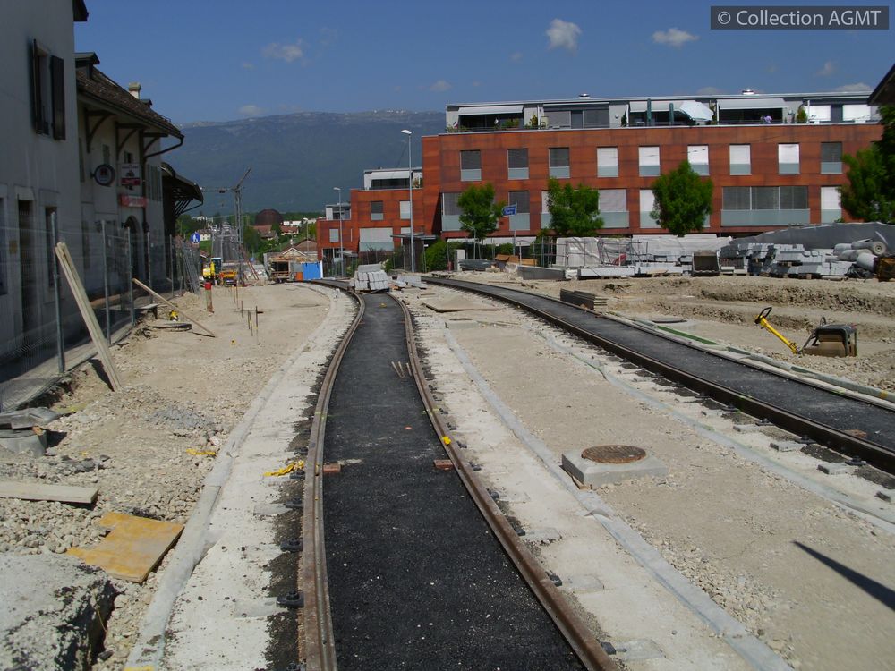 Meyrin-village : dans la descente de la route de Meyrin en direction du CERN, la nouvelle double voie de tram est déjà partiellement goudronnée |