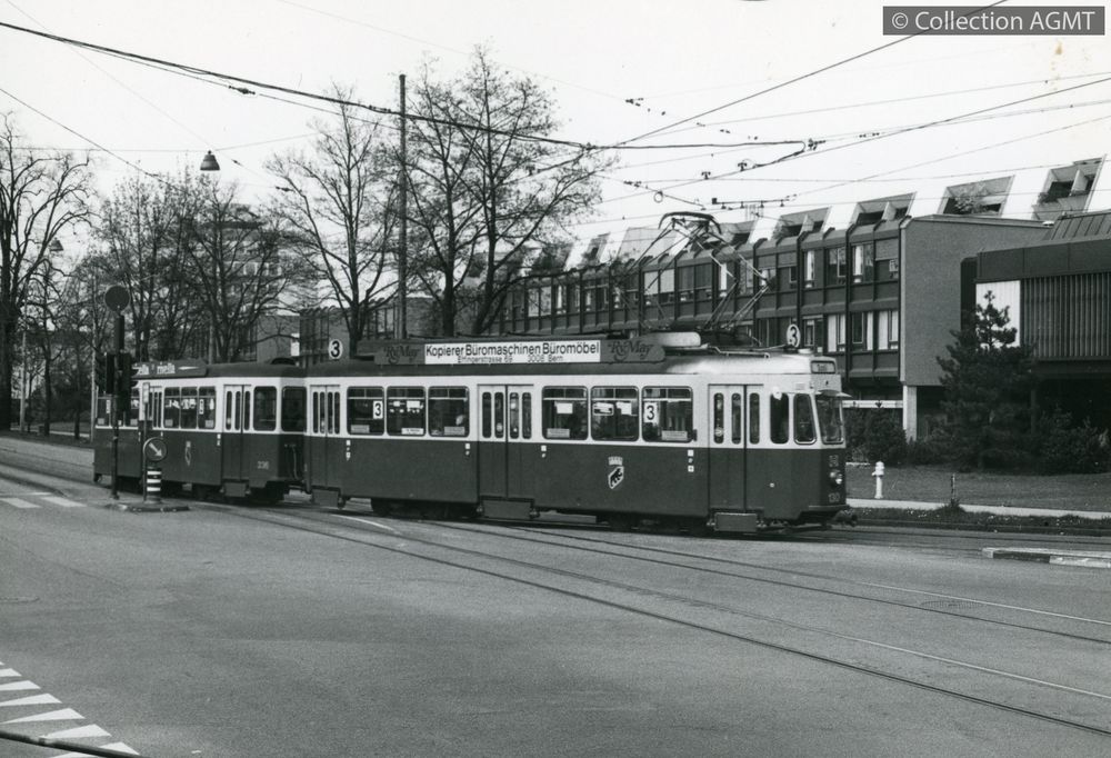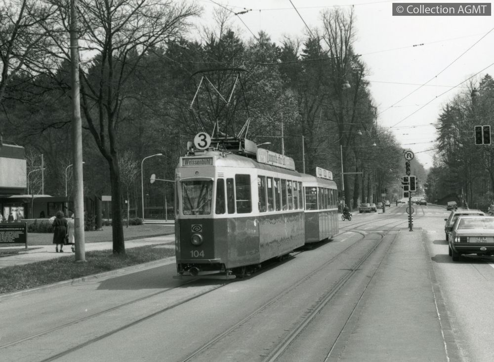3141(494.241)_SVB_1985-01.jpgImage JpegUn convoi normalisé des SVB, en service sur la ligne 3, mené par l'automotrice 104, circule à la Muristrasse, à proximité de l'arrêt "Egghoelzli" / Jeremy Wiseman