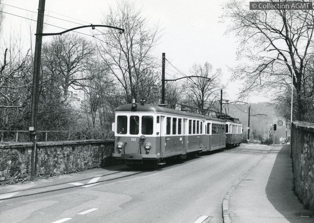 [Compagnie] VBWIndex. décimale : 4341 Chemin de fer interurbain et vicinal - véhicule - service régulier, transport de voyageur Une rame réversible du RBS, en service sur la ligne G, circule sur un tronçon de voie en chaussée à Muri [document graphique à deux dimensions] / Jeremy Wiseman (1933-2022), Photographe . - [S.l.] : [s.n.], [ca 1985] . - 1 photographie : noir et blanc ; 11 x 15 cm.