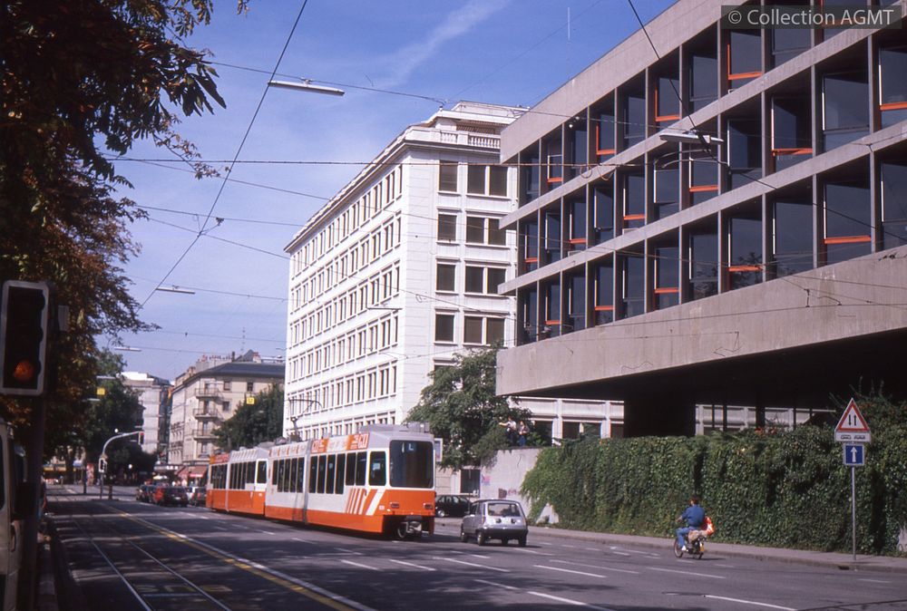 Genève, boulevard Georges-Favon : une double traction d'automotrices DAV des TPG, assurant une course de formation, se dirige vers le dépôt de la Jonction |