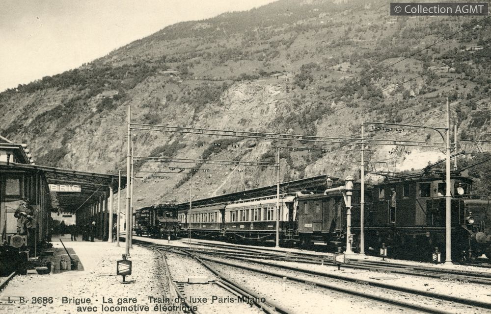 [Compagnie] CIWLIndex. décimale : 4341 Chemin de fer interurbain et vicinal - véhicule - service régulier, transport de voyageur Brigue, la gare : train de luxe Paris-Milano avec locomotive électrique [document graphique à deux dimensions] . - Lausanne : Editions Louis Burgy, [ca 1910] . - 1 carte postale : noir et blanc ; 9 x 14 cm. - (L. Burgy; 3686) .