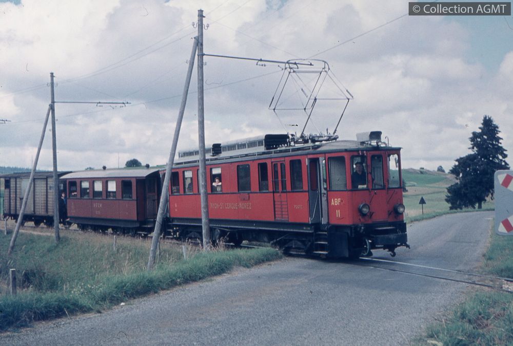 A proximité de La Cure, un convoi du NStCM mené par l'automotrice ABFe 4/4 11 traverse un passage à niveau non gardé [document projeté ou vidéo] / Jeremy Wiseman (1933-2022), Photographe . - [S.l.] : Champion, [ca 1958] . - 1 diapositive : couleur ; 5 x 5 cm. Langues : Français ( fre) |  |