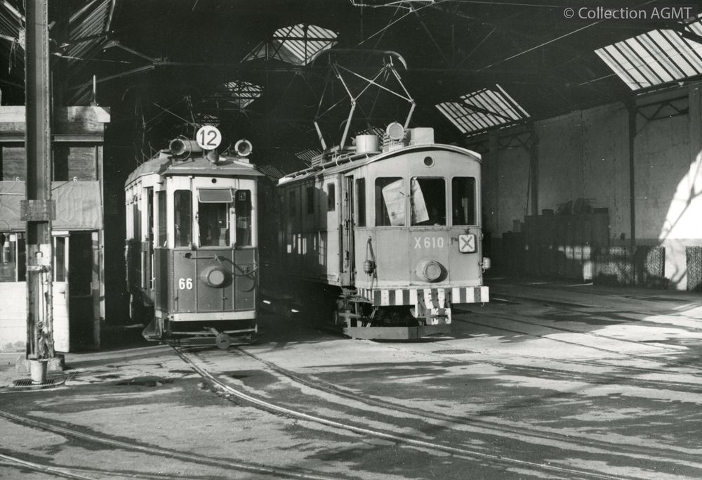 [Ligne] Ligne 12Index. décimale : 3141 Tramway et métro léger urbain - véhicule - service régulier, transport de voyageur L'automotrice 66 de la CGTE stationne sous une halle du dépôt de la Jonction à côté de l'éboueuse 610 [document graphique à deux dimensions] / Jeremy Wiseman (1933-2022), Photographe . - [S.l.] : [s.n.], [ca 1967] . - 1 photographie : noir et blanc ; 11 x 15 cm.