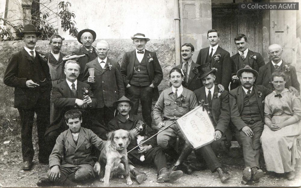 Titre : Les membres de l'Esquipot CGTE, Section de Bernex - Chancy, posent pour le photographe avec leur drapeau Type de document : document graphique à deux dimensions Année de publication : [ca 1920] Importance : 1 photo Présentation : noir et blanc Format : 9 x 14 cm Langues : Français (fre) Catégories : [Mots-clefs] Chaize