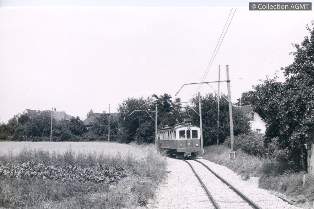 L'automotrice BDe 4/4 11 du BTI, prise en location au SZB, circule entre la village et la gare d'Anet |