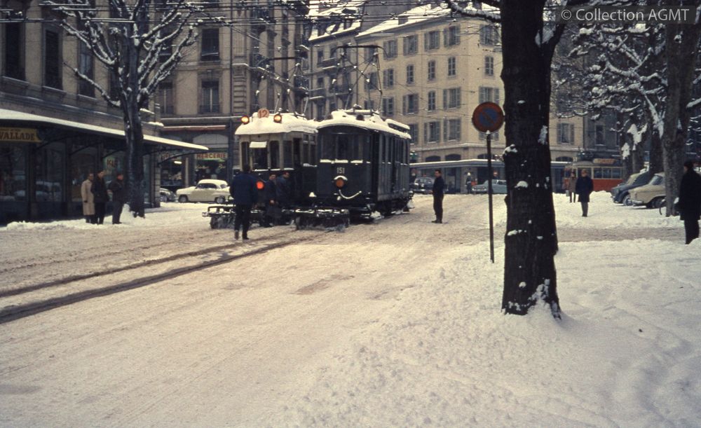 PermalinkDéneigement au boulevard James-Fazy, avec l'automotrice 61 et le tracteur 151 qui circulent en parallèle en poussant une racleuse à neige / Richard J.S. Wiseman