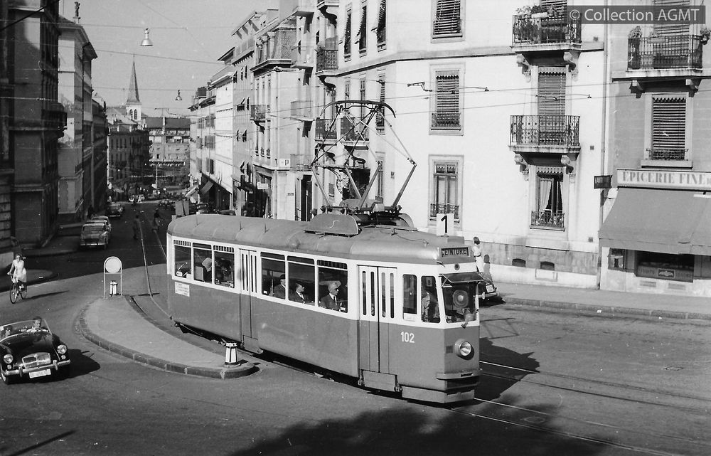 L'automotrice Ce 4/4 102 des VBL, louée par la CGTE pour des essais avant l'acquisition d'occasion du solde de la série, qui assure une course de la ligne 1A arrive en haut de la rue des Glacis-de-Rive |