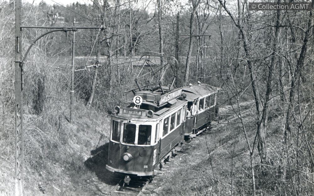 Un convoi CGTE de la ligne 8 à destination de Veyrier, formé de l'automotrice Ce 2/2 116 et d'une remorque série C2i 201-210, passe dans la tranchée de Sierne [document graphique à deux dimensions] / Jeremy Wiseman (1933-2022), Photographe . - [S.l.] : [s.n.], [ca 1956] . - 1 photographie : noir et blanc ; 9 x 15 cm. Langues : Français ( fre) |  |