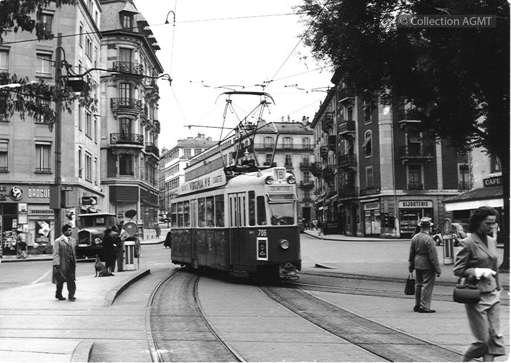 3141(494.42)_CGTE_1960-10.jpgImage JpegL'automotrice 706, de la ligne 1B, passe la bifurcation entre les lignes 1 et 2 à la place des Eaux-Vives / Jacques Bazin