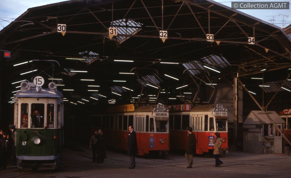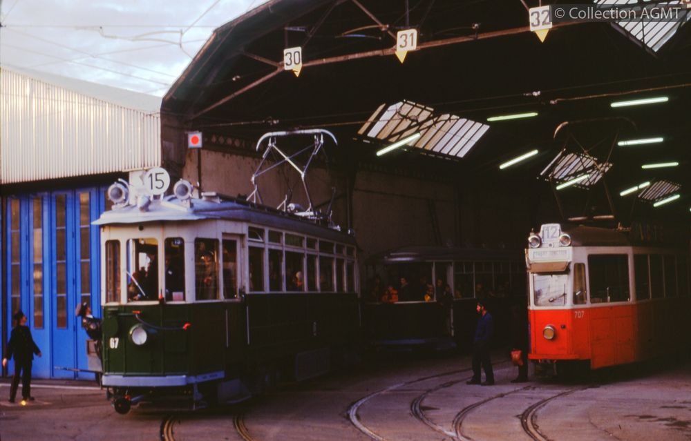 PermalinkLe convoi AGMT refoule sur le triangle de rebroussement du dépôt de la Jonction et entre dans une halle ou stationnent les automotrices 707 et 713 de la CGTE / Jean-Marc Bongni