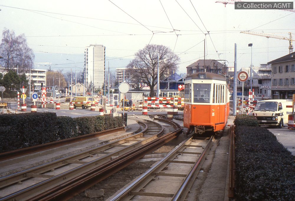 3124(494.42)_TPG_1986-01_d.jpgImage JpegUn convoi "Normalisé" des TPG, comprenant la remorque 305, quitte le terminus de Moillesulaz où les travaux de transformation de la boucle de rebroussement sont en cours / Jeremy Wiseman