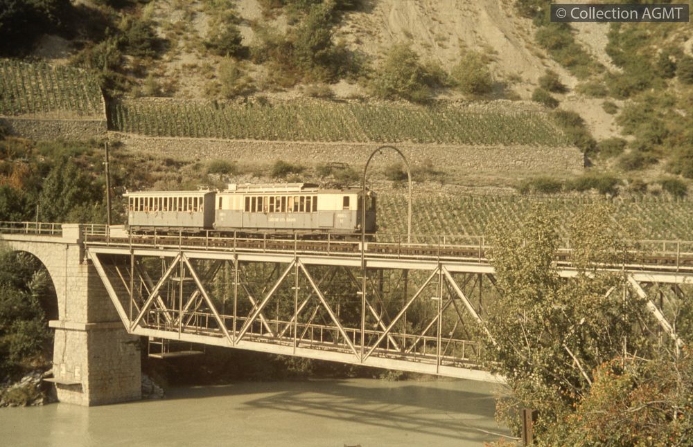 Mené par l'automotrice ABFe 2/4 11, un convoi du LLB arrivant de Loèche-les-Bains franchit le Rhône sur un pont métalique juste avant l'arrivée au terminus de Loèche [document projeté ou vidéo] / Jeremy Wiseman (1933-2022), Photographe . - [S.l.] : Champion, [ca 1966] . - 1 diapositive : 5 x 5 cm ; couleur. Langues : Français ( fre) |  |