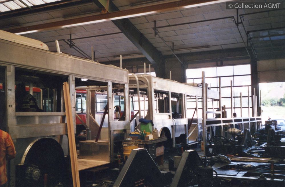 Carrosserie Hess, Bellach : vue de 3/4 arrière droit de la caisse d'un trolleybus articulé TPG en construction |