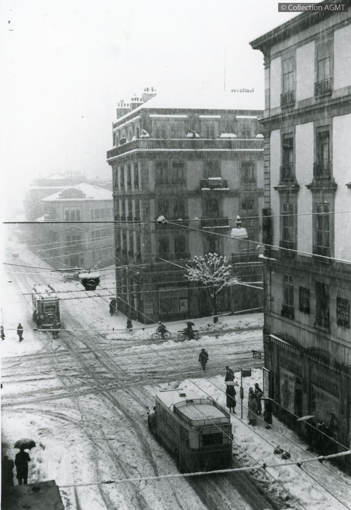 Au carrefour entre le boulevard Georges-Favon et la rue du Stand, un bus CGTE pour Chancy et une automotrice de la ligne 2 attendent, sous la neige qui tombe dru, que la lanterne japonaise leur donne le passage [document graphique à deux dimensions] . - [S.l.] : [s.n.], [ca 1970] . - 1 photographie : noir et blanc ; 15 x 10 cm. Langues : Français ( fre) |  |
