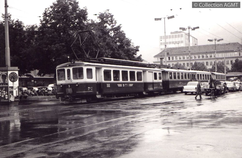 PermalinkPermalinkPermalinkL'automotrice BFe 4/4 5 du BTI stationne sur la place de la Gare de Bienne en tête d'un convoi de trois voitures / Jacques Bazin