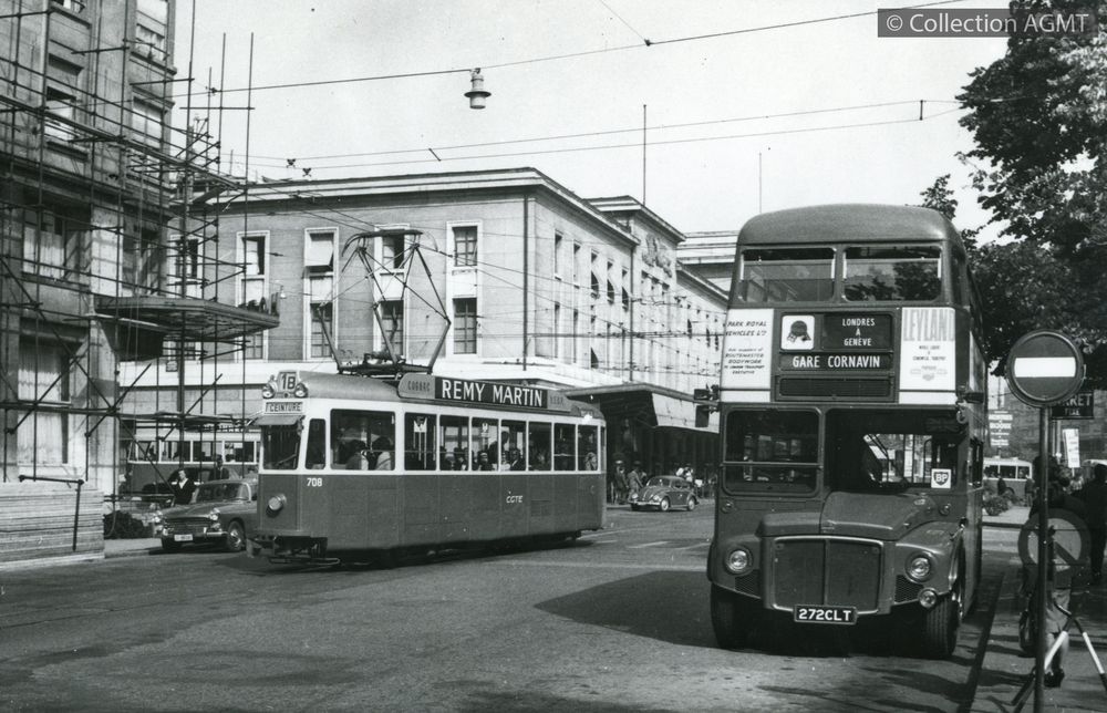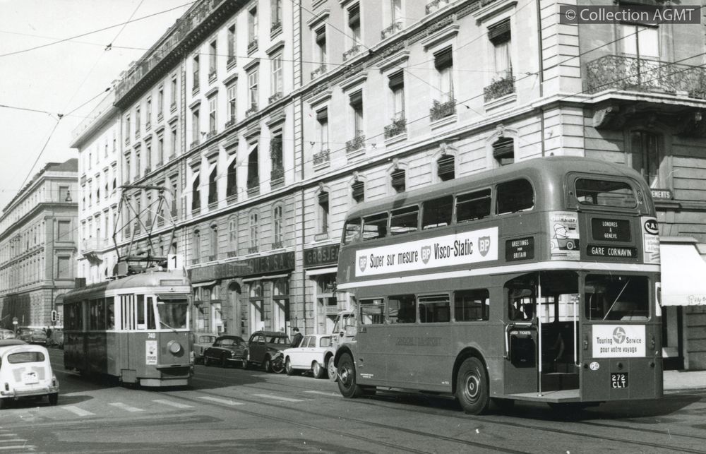PermalinkPermalinkEn service sur la ligne 1B, l'automotrice 708 de la CGTE quitte la place de Cornavin où stationne un bus londonien à impériale / Jeremy Wiseman