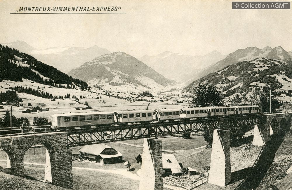 "Montreux-Simmenthal-Express" : Fahrzeit Montreux-Interlaken od. vice-versa 4 Stunden [document graphique à deux dimensions] . - Berne : Edition phot. Franco-Suisse, [ca 1910] . - 1 carte postale : noir et blanc ; 9 x 14 cm. Langues : Allemand (ger)