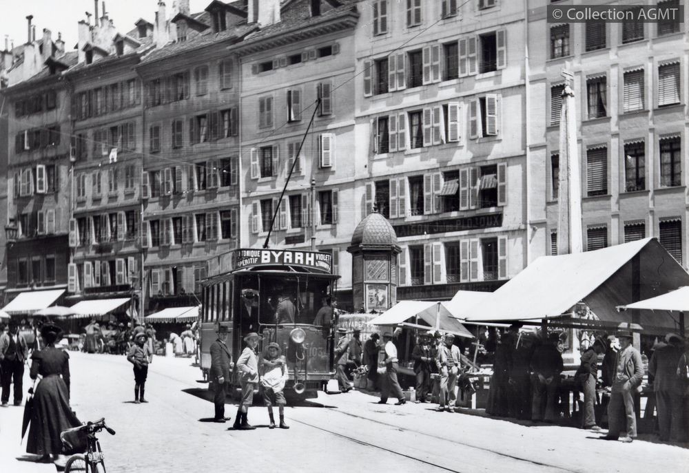 [Année] 1882-1901Résumé : C'est à Berlin en 1879 qu'a circulé la première locomotive alimentée par une source d'énergie indépendante du véhicule. En Suisse, l'ingénieur René Thury met en service en 1884, à titre expérimental, un court chemin-de-fer électrique à Territet. A Genève, les TS s'intéressèrent dès 1882 à la traction électrique. Ils craignaient cependant que les autorités ne s'opposent à la mise en place de la ligne aérienne. Finalement, en 1894, sera mise en service la ligne de tramway électrique Petit-Saconnex - Champel. L'électricité s'imposa comme seule possibilité d'exploiter cette ligne sinueuse et présentant de fortes rampes. En 1896, la ligne Carouge - Moillesulaz sera électrifiée à son tour. Le parc initial se composait de 8 automotrices Ce 1/2. Deux trams à cheval et une automotrice électrique de la ligne Petit-Saconnex - Champel se rencontrent à la place Cornavin en 1896 / Frédéric Boissonnas
