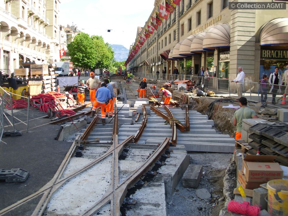 Au bas de la rue de la Corraterie, les voies de la courbe donnant accès aux rues basses ont été posées, ainsi qu'un croisement pour la nouvelle voie en direction de la place Bel-Air |