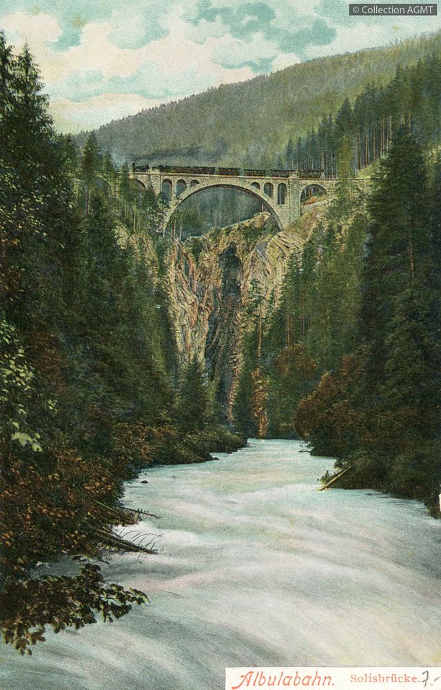 [Année] 1905Index. décimale : 4341 Chemin de fer interurbain et vicinal - véhicule - service régulier, transport de voyageur Albulabahn : Solisbruecke [document graphique à deux dimensions] . - Kilchberg-Zuerich : Gebr. Wehrli, [ca 1905] . - 1 carte postale : colorisée ; 14 x 9 cm. - (Wehrli; 7457) .
