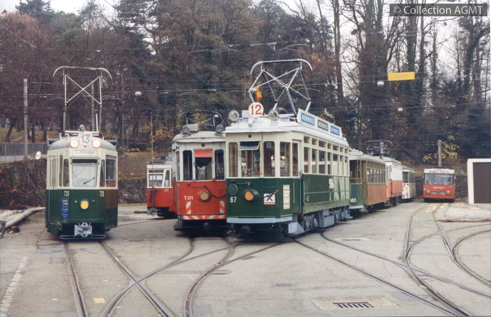 PermalinkFaute de place au dépôt du Bachet, le convoi normalisé des TPG formé de l'automotrice 729 et de la remorque 308, fraichement préservé par l'AGMT, stationne en plein air sur une voie de garage de la boucle du rondeau de Carouge / François Chapuis