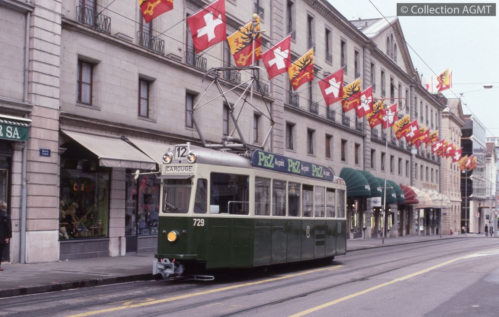 PermalinkL'automotrice 729 de l'AGMT circule à la rue de la Corraterie en direction de Carouge / Jean-Marc Bongni