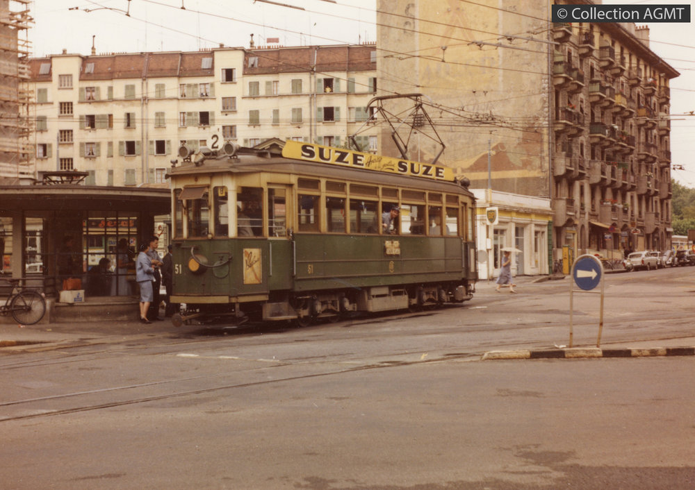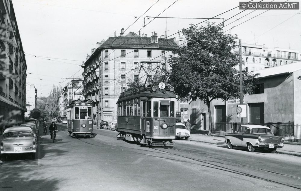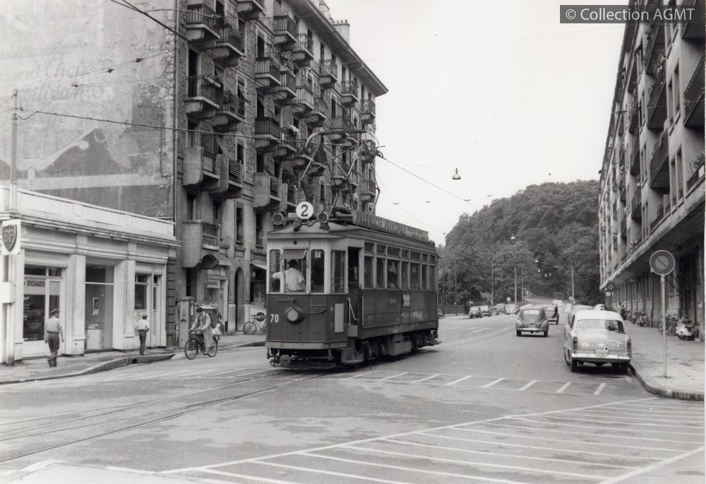 3141(494.42)_CGTE_1961-65.jpgImage JpegCirculant sur la ligne 2 en direction de Bernex, l'automotrice 70 passe à la rue des Deux-Ponts / Jacques Bazin