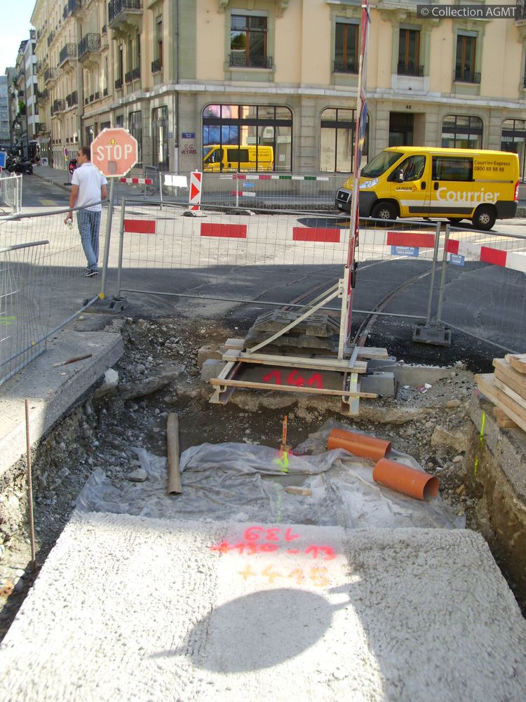 [Année] 2011Index. décimale : 3123 Tramway et métro léger urbain - infrastructure, ouvrage d'art, superstructure, énergie - construction de l'infrastructure, infrastructure en service Genève, rue de l'Arquebuse : le radier destiné à accueillir la nouvelle voie de tram en direction de Bernex est coulé et la courbe de jonction avec la rue du Stand est déjà posée [document graphique à deux dimensions] / Cédric Noir, Photographe . - Genève : Migros, 2012 . - 1 photographie : couleur ; 12 x 9 cm.