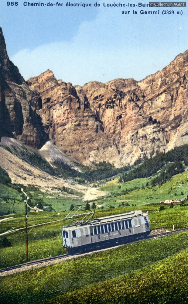 Chemin-de-fer électrique de Louèche-les-Bains et vue sur la Gemmi (2329 m) [document graphique à deux dimensions] . - Neuchâtel : Phototypie, [ca 1921] . - 1 carte postale : colorisée ; 14 x 9 cm. Langues : Français (fre)