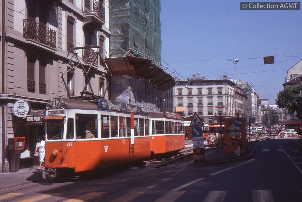 3141(494.42)_CGTE_1958-19.jpgImage JpegEn service sur la ligne 12 à destination de Carouge, un convoi TPG formé de l'automotrice 727 et de la remorque 305 marque l'arrêt Plainpalais, déplacé au début de la rue de Carouge en raison de travaux de voie / Jeremy Wiseman