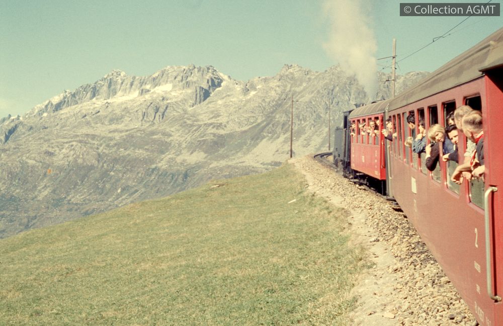 Vue vers l'avant depuis la troisième voiture d'un train à vapeur montant à l'Oberalp depuis Andermatt [document projeté ou vidéo] / Jeremy Wiseman (1933-2022), Photographe . - [S.l.] : [s.n.], [ca 1967] . - 1 diapositive : couleur ; 5 x 5 cm. Langues : Allemand (ger)