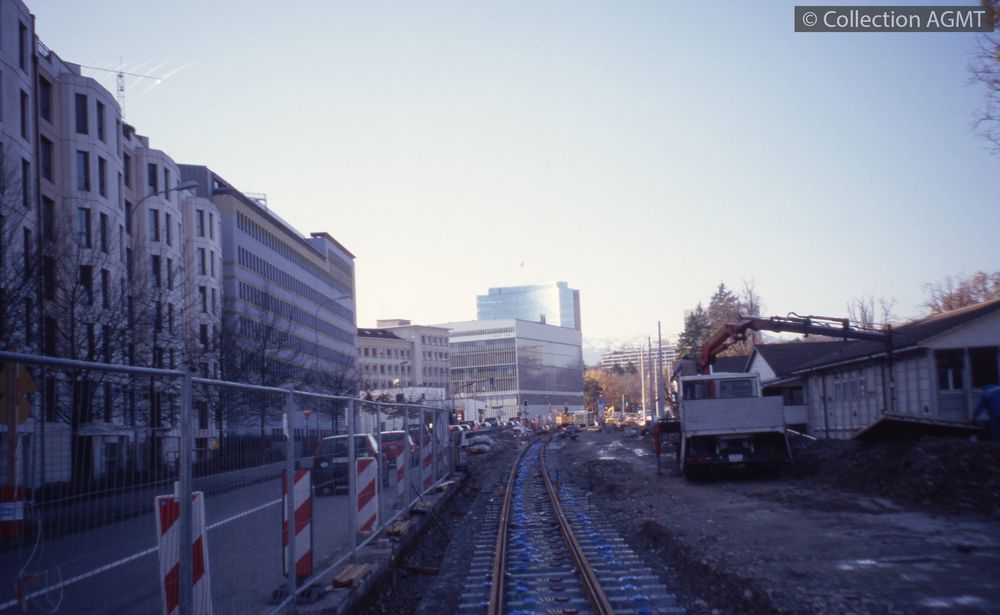 PermalinkAu bas de l'avenue de France, les voies du prolongement de la ligne 13 de Cornavin à la place des Nations sont posées sur des traverses prévues pour trois files de rails / Richard J.S. Wiseman