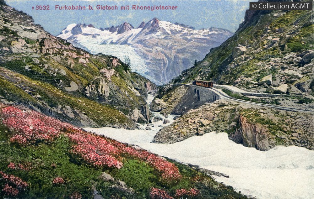 Furkabahn b. Gletsch mit Rhonegletscher [document graphique à deux dimensions] . - [S.l.] : [s.n.], [ca 1915] . - 1 carte postale : colorisée ; 9 x 14 cm. Langues : Allemand (ger)