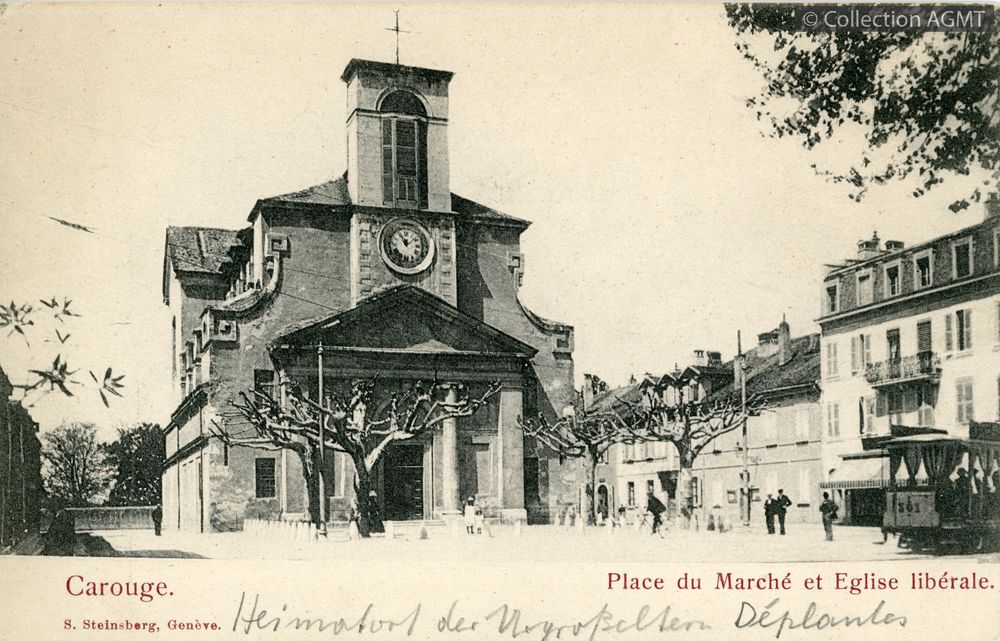 [Année] 1902Index. décimale : 3141 Tramway et métro léger urbain - véhicule - service régulier, transport de voyageur Carouge : place du Marché et Eglise libérale [document graphique à deux dimensions] . - Genève : S. Steinsberg, [ca 1902] . - 1 carte postale : noir et blanc ; 9 x 14 cm.