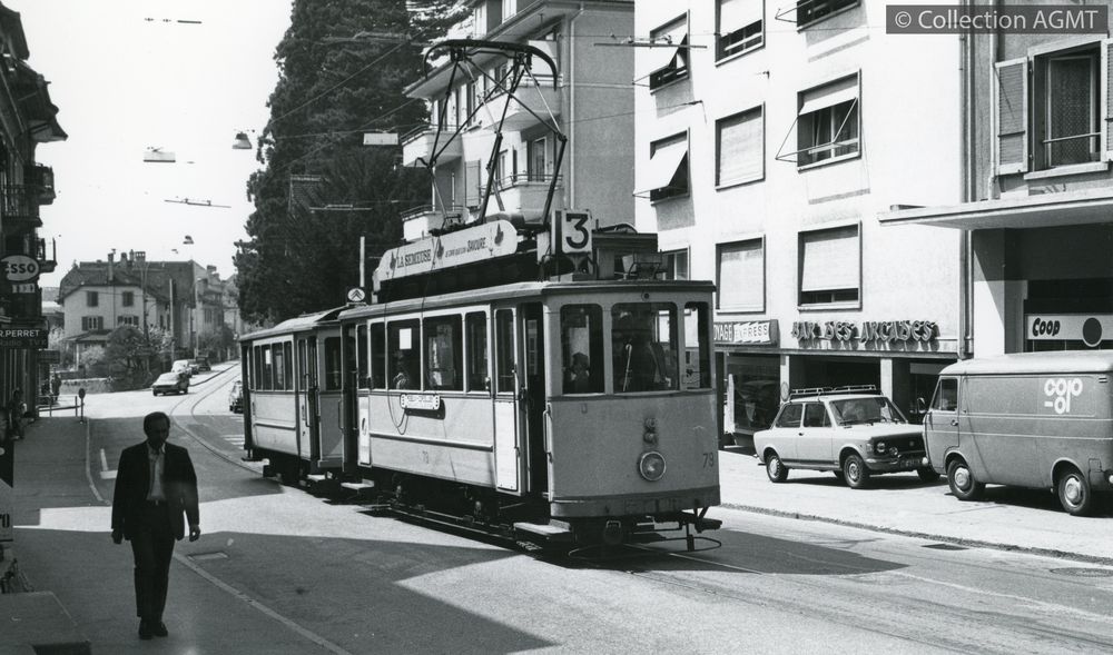 En service sur la ligne 3 à destination de la place Pury, un convoi TN formé de l'automotrice 79 et de la remorque 141 circule à la Grand'Rue à Peseux [document graphique à deux dimensions] / Jeremy Wiseman (1933-2022), Photographe . - [S.l.] : [s.n.], [ca 1976] . - 1 photographie : noir et blanc ; 11 x 18 cm. Langues : Français ( fre) |  |