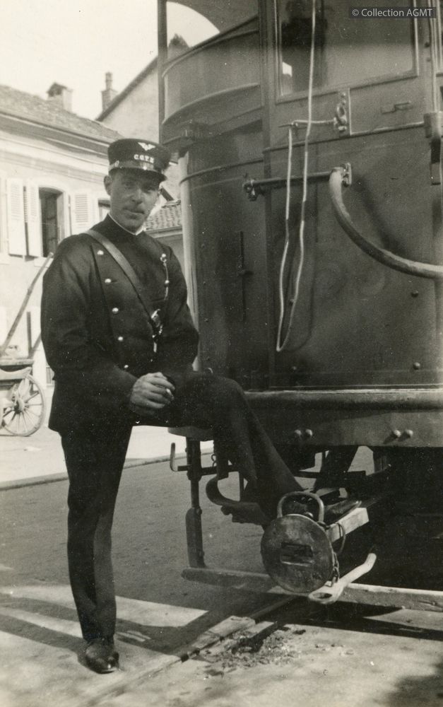 Le receveur Emile Kunz pose devant l'automotrice 58 de la CGTE stationnée au terminus de la ligne 7 à Ferney-Voltaire [document graphique à deux dimensions] . - [S.l.] : [s.n.], [ca 1933] . - 1 photographie : noir et blanc ; 9 x 6 cm. Langues : Français (fre)