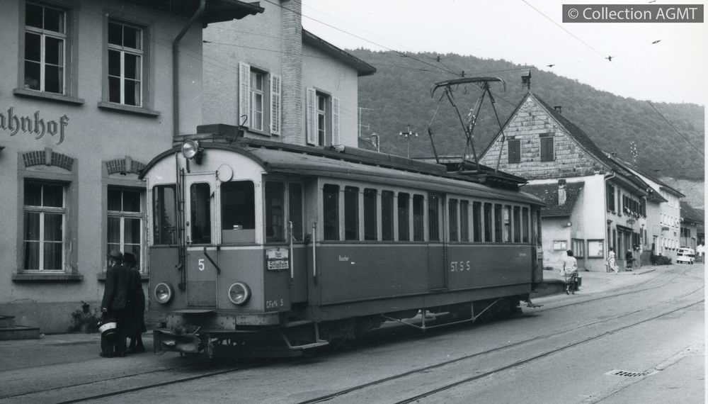 CFe 4/4 5 (série 1-5, SIG/MFO, 1905) faisant halte à Beringen [document graphique à deux dimensions] / Jeremy Wiseman (1933-2022), Photographe . - [S.l.] : [s.n.], [ca 1970] . - 1 photographie : noir et blanc ; 8 x 13 cm. Langues : Français (fre)