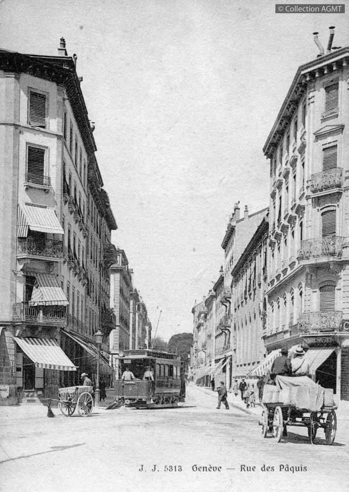 [Année] 1905Index. décimale : 3141 Tramway et métro léger urbain - véhicule - service régulier, transport de voyageur Genève : rue des Pâquis [document graphique à deux dimensions] . - Genève : Jullien frères, [ca 1905] . - 1 carte postale : noir et blanc ; 15 x 9 cm.