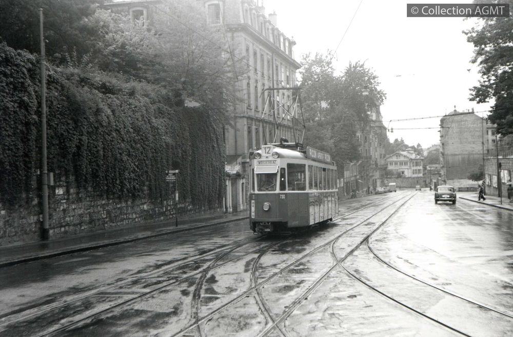 PermalinkEn service sur la ligne 12 à destination de Moillesulaz, l'automotrice 730 passe au niveau des aiguillages de la bifurcation de la gare des Eaux-Vives / Jacques Bazin