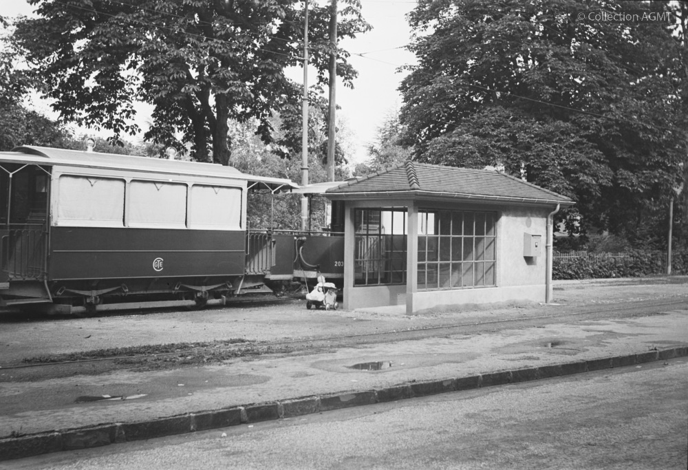 Genève, route de Florissant : vue de 3/4 d'un abri pour voyageurs situé entre les deux voies d'un évitement et derrière lequel stationnent deux remorques C2i de la CGTE, série 201-210, dont la 203 |