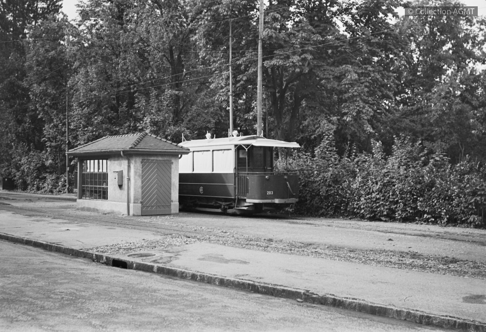 Genève, route de Florissant : vue de 3/4 d'un abri pour voyageurs situé entre les deux voies d'un évitement et derrière lequel stationnent deux remorques C2i de la CGTE, série 201-210, dont la 203 |