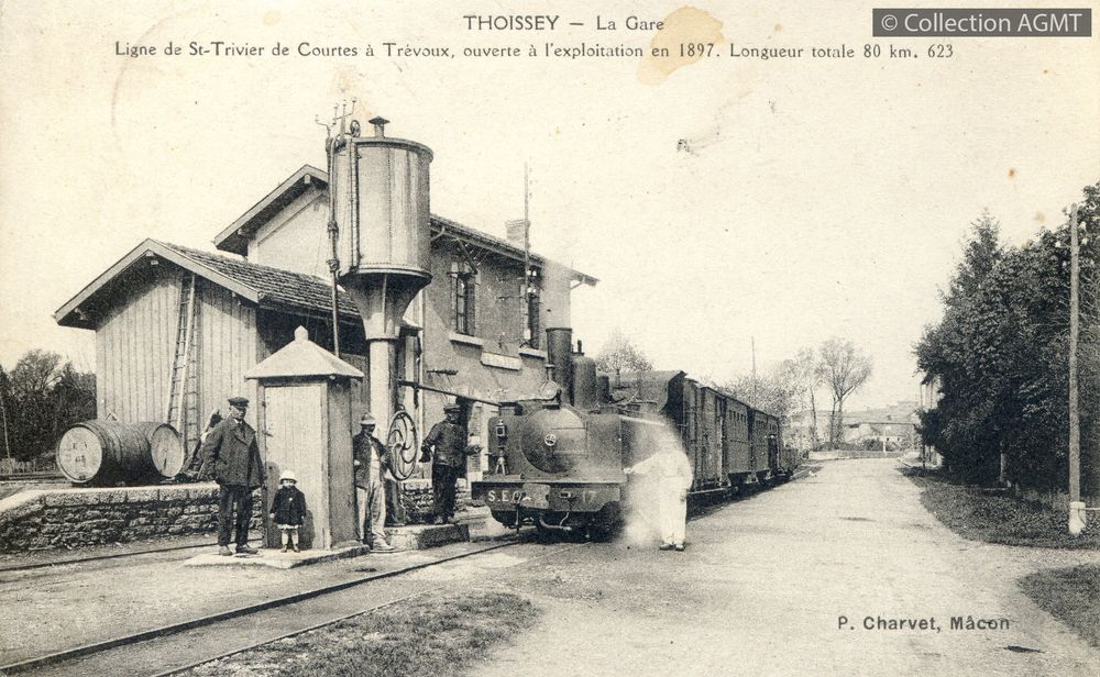 [Ligne] TrevouxIndex. décimale : 4341 Chemin de fer interurbain et vicinal - véhicule - service régulier, transport de voyageur Thoissey : la gare : ligne de St-Trivier de Courtes à Trévoux, ouverte à l'exploitation en 1897, longueur totale 80 km 623 [document graphique à deux dimensions] / Petit, Photographe . - Mâcon : P. Charvet, [ca 1910] . - 1 carte postale : noir et blanc ; 9 x 14 cm.
